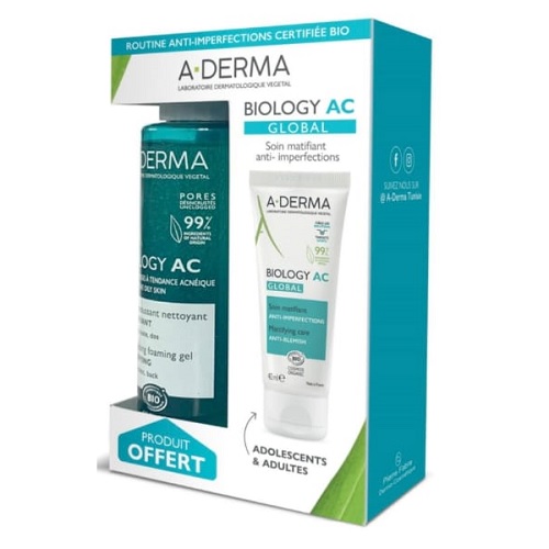 A-Derma Pack Biology AC Global + Gel Nettoyant Offert : Le Duo Idéal pour les Peaux Mixtes à Grasses à Tendance Acnéique