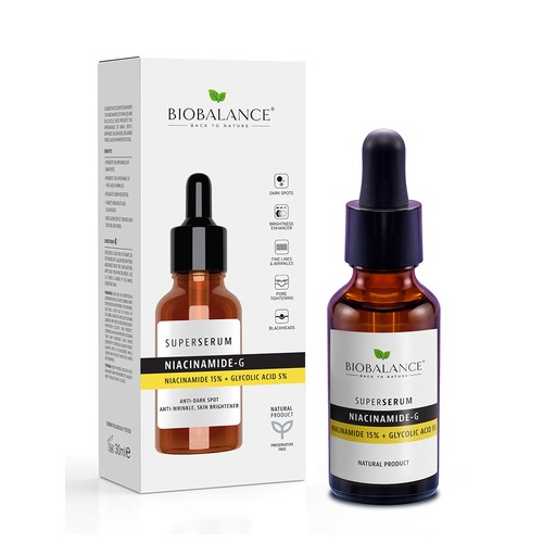 La peau peut souffrir de taches brunes, rides, excès de sébum ou imperfections. Biobalance Sérum Niacinamide G apporte une solution complète grâce à sa formule innovante : 15 % de Niacinamide et 5 % d’Acide Glycolique. Testé dermatologiquement, ce sérum unifie le teint, atténue les rides et régule la production de sébum pour une peau éclatante et saine.