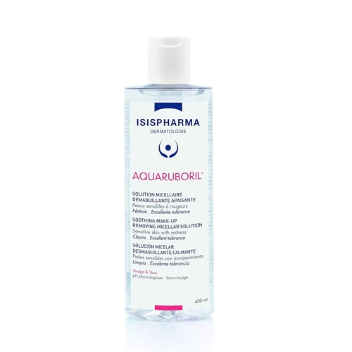 Isispharma Aquaruboril Solution Micellaire est un nettoyant doux et une solution démaquillante spécialement formulée pour les peaux sensibles sujettes aux rougeurs. Grâce à ses propriétés apaisantes et hydratantes, elle offre une expérience de soin quotidienne qui combine efficacité et respect de l’équilibre cutané.