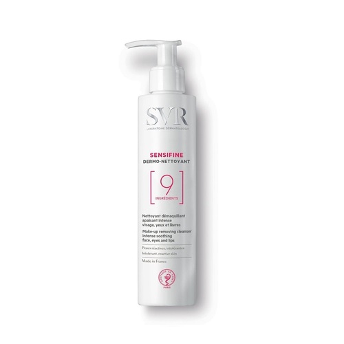 SVR Sensifine Dermo-Nettoyant Démaquillant Apaisant Intense s’adresse aux peaux sensibles, réactives ou intolérantes. Grâce à sa texture gel-lait fondante, il élimine en douceur les impuretés, le maquillage (même waterproof) ainsi que les particules de pollution, sans agresser l’épiderme.