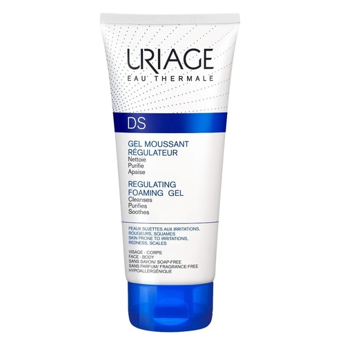 Le Gel Moussant Régulateur de la gamme DS de URIAGE nettoie, purifie et apaise les peaux sujettes aux irritations, rougeurs et squames. Ce nettoyant doux non desséchant élimine donc les impuretés grâce à l’efficacité conjuguée d’actifs assainissants spécifiques et d’un complexe breveté anti-irritant, le TLR2-Regul, associés à l’Eau Thermale d’Uriage apaisante.